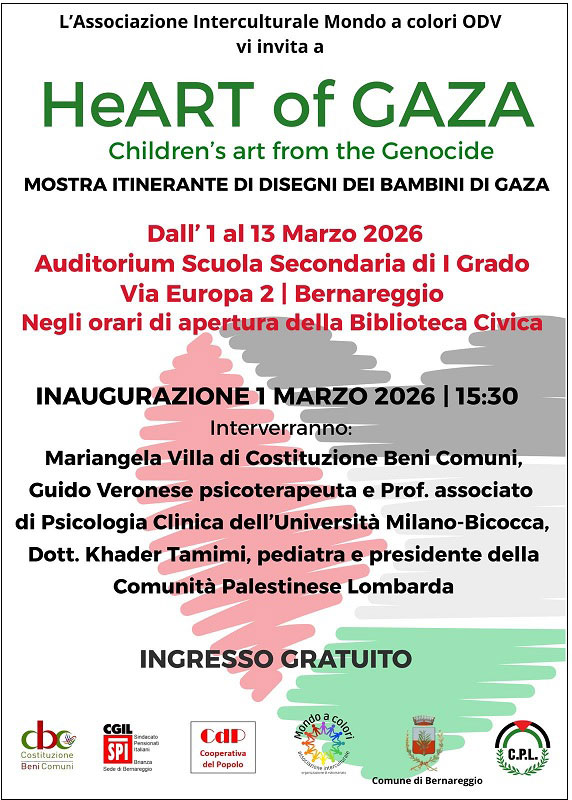 L'associazione "Mondo a Colori" in collaborazione con alcune associazioni del territorio esporrà a Bernareggio "HeART of Gaza" una mostra itinerante di disegni realizzati da bambini e ragazzi che vivono nella Striscia di Gaza (principalmente Deir Al-Balah). Questa mostra ha finora raggiunto oltre 80 paesi in due continenti.