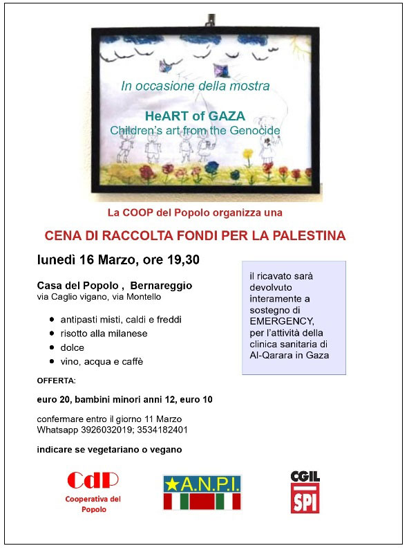 Inoltre, in occasione della mostra, la sera del 16 Marzo alla Casa del Popolo di Bernareggio si terrà una CENA DI RACCOLTA FONDI PER LA PALESTINA.